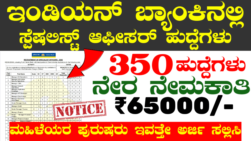 ಭಾರತೀಯ ಇಂಡಿಯನ್ ಬ್ಯಾಂಕಿನಲ್ಲಿ ನೇಮಕಾತಿ ನಡೆಯುತ್ತಿದೆ, indian bank ಒಟ್ಟು 350 ಹುದ್ದೆಗೆ ಅರ್ಜಿ( ಸ್ಪೆಷಲಿಸ್ಟ್ ಆಫೀಸರ್) ಪೋಸ್ಟ್ಗಳಿಗೆ ನೇಮಕಾತಿ ನಡೆಯುತ್ತಿದೆ ಇಲ್ಲಿ ನಿಯಮಗಳ ಪ್ರಕಾರ ಮಹಿಳೆಯರು ಪುರುಷರು ಅರ್ಜಿ ಸಲ್ಲಿಸಲು ಅವಕಾಶ ನೀಡಿದ್ದಾರೆ ಯಾವ ಹುದ್ದೆ ಬೇಕು ಮತ್ತು ಎಲ್ಲಿ ಬೇಕು ಎಲ್ಲಾ ಆಯ್ಕೆ ಮಾಡಿಕೊಂಡು ಸರಿಯಾಗಿ ಅಪ್ಲಿಕೇಷನ್ ಹಾಕಿ.