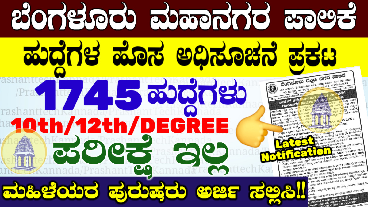 BBMP ನೇಮಕಾತಿ ಒಟ್ಟಿಗೆ 1745 ಹುದ್ದೆಗಳಿಗೆ ಅರ್ಜಿ ಕರೆಯಲಾಗಿದೆ ನಾಳೆ ಕೊನೆಯ ದಿನಾಂಕ ಪರೀಕ್ಷೆ ಇಲ್ಲ ಮಹಿಳೆಯರ ಪುರುಷರು ಇವತ್ತೇ ಅರ್ಜಿ ಸಲ್ಲಿಸಿ ಬೆಂಗಳೂರು ದಕ್ಷಿಣ ನಗರ ನಿಗಮದಲ್ಲಿ ಸಂಪೂರ್ಣ ಮಾಹಿತಿ ನೋಡಿ.