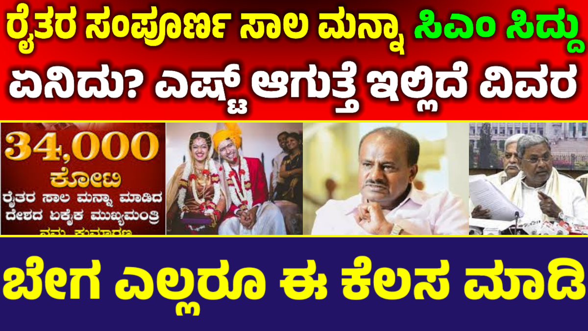 ಈ ಹಿಂದೆ ಕುಮಾರಸ್ವಾಮಿ ಅವರು ಮುಖ್ಯಮಂತ್ರಿ ಇದ್ದಾಗ ಸುಮಾರು 34,000 ಕೋಟಿ ರೈತರ ಸಾಲ ಮನ್ನಾ ಮಾಡಿದ್ದಾರೆ ಆಗ ರೈತರು ಸಾಲ ಮನ್ನಾ ಮಾಡಿದ್ದಾರೆ ಎಂದು ಖುಷಿ ಪಟ್ಟು ಮತ್ತೆ ಚೇಂಜಿ ಸರ್ಕಾರ ಮಾಡಿತ್ತು ಯಡಿಯೂರಪ್ಪ ಸರಕಾರ ಇದ್ದಾಗ ರೈತರ ಸಾಲ ಮನ್ನಾ ಮಾಡಲಾಗಿತ್ತು ಆದರೆ ಈಗ ಪ್ರಸ್ತುತ ಕರ್ನಾಟಕದಲ್ಲಿ ಸಿಎಂ ಸಿದ್ದರಾಮಯ್ಯ ಕಾಂಗ್ರೆಸ್ ಸರ್ಕಾರ ಇದೆ ಈಗ ಕರ್ನಾಟಕ ರಾಜ್ಯದಲ್ಲಿ ಮತ್ತೊಂದು ಸುದ್ದಿ ಕೇಳಿ ಬರ್ತಾ ಇದೆ ರೈತರದು ಸಾಲ ಮನ್ನಾ ಮಾಡುತ್ತಾರಾ? ಮಾಡಿದರೆ ಎಷ್ಟು ಮಾಡುತ್ತಾರೆ ಎಲ್ಲದರ ಬಗ್ಗೆ ವಿವರವಾದ ಮಾಹಿತಿ ಇಲ್ಲಿ ಕೆಳಗಡೆ ಇದೆ ನೋಡಿ.