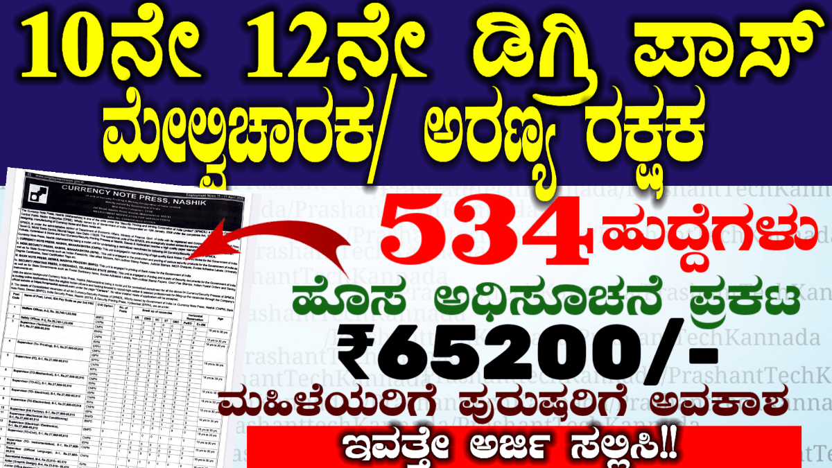 ಭಾರತದಲ್ಲಿ ಕರೆನ್ಸಿ ನೋಟ್ ಪ್ರೆಸ್ ಸಂಸ್ಥೆಯಲ್ಲಿ 534 ಹುದ್ದೆಗಳಿಗೆ ನೇಮಕಾತಿ ನಡೆಯುತ್ತಿದೆ ಇಲ್ಲಿ ಸುರಕ್ಷಿತ ಅಧಿಕಾರಿ ಮೇಲ್ವಿಚಾರಕ ಜೂನಿಯರ್ ಆಫೀಸ್ ಅಸಿಸ್ಟೆಂಟ್ ಹಾಗೂ ಇತರೆ ಹುದ್ದೆಗಳಿಗೆ ನೇಮಕಾತಿ.
