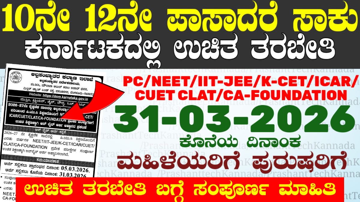 2026-27 ಸಾಲಿನಲ್ಲಿ ವಿದ್ಯಾರ್ಥಿಗಳು ಈ ಅಲ್ಪಸಂಖ್ಯಾತರ ಕಲ್ಯಾಣ ಇಲಾಖೆಯಲ್ಲಿ ಉಚಿತ ತರಬೇತಿಗೆ ಅಪ್ಲಿಕೇಶನ್ ಹಾಕಲು ಕೊನೆಯ ದಿನಾಂಕ ಹೀಗಿದೆ: Application Star: 05-3-2026 ರಿಂದ 31-3-2026 ವರೆಗೆ ಅವಕಾಶ ಕೊಡಲಾಗಿದೆ.