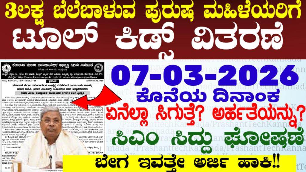 ಹೌದು ಕರ್ನಾಟಕ ರಾಜ್ಯದಲ್ಲಿ ಕರ್ನಾಟಕ ವಿಶ್ವಕರ್ಮ ಸಮುದಾಯ ಅಭಿವೃದ್ಧಿ ನಿಗಮದಿಂದ ಕರ್ನಾಟಕ ರಾಜ್ಯದ ಮಹಿಳೆಯರಿಗೆ ಪುರುಷರಿಗೆ 3,ಲಕ್ಷ ಬೆಲೆ ಬಾಳುವ ಟೂಲ್ ಕಿಡ್ಸ್ ಗಳು( ವಸ್ತುಗಳು) ನೀಡುತ್ತಿದ್ದಾರೆ ಅರ್ಜಿ ಸಲ್ಲಿಸಲು ಕೊನೆಯ ದಿನಾಂಕ 07-3-2026 ಈ ದಿನಾಂಕ ಮುಂಚಿತವಾಗಿ ಅಪ್ಲೈ ಮಾಡಿ.