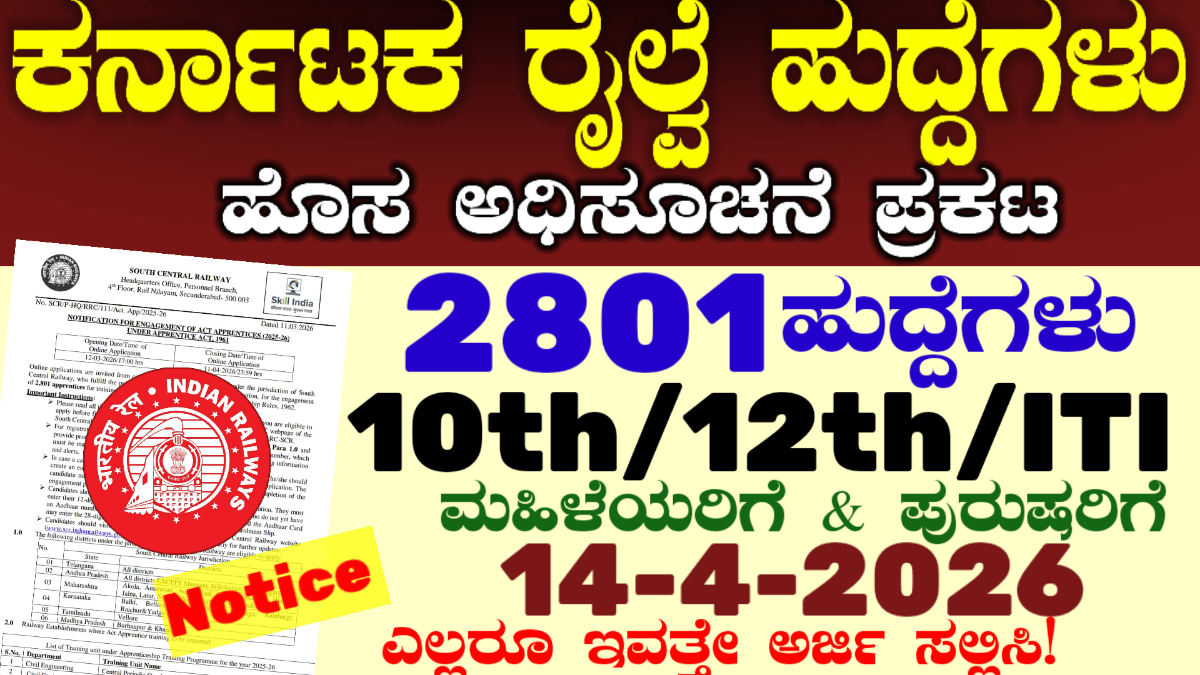 Hubli Railway recruitment 2026- ಕರ್ನಾಟಕ ದಕ್ಷಿಣ ಮಧ್ಯ ರೈಲ್ವೆ ನೇಮಕಾತಿ 2026: 10ನೇ 12ನೇ iti ಪಾಸ್ ಇವತ್ತೇ ಅರ್ಜಿ ಸಲ್ಲಿಸಿ ಸಂಪೂರ್ಣ ಮಾಹಿತಿ ಕೆಳಗಡೆ ಇದೆ ನೋಡಿ     ಕರ್ನಾಟಕ: ಕರ್ನಾಟಕ ದಕ್ಷಿಣ ಮಧ್ಯ ರೈಲ್ವೆ ಇಲಾಖೆಯಲ್ಲಿ 2801 ಹುದ್ದೆಗಳಿಗೆ ನೇಮಕಾತಿ ಆಗುತ್ತಿದೆ 10ನೇ 12ನೇ ಐಟಿಐ ಪಾಸಾದವರಿಗೆ ಮಹಿಳೆಯರಿಗೆ ಪುರುಷರಿಗೆ ಕರ್ನಾಟಕದ ಬಳ್ಳಾರಿ, ಬೀದರ್, ಬೆಳಗಾವಿ ,ಗುಲ್ಬರ್ಗ ,ಕಲಬುರ್ಗಿ ,ರೈಚೂರು ಯಾದಗಿರಿ ಹಾಗೂ ಇತರ ಜಿಲ್ಲೆಗಳಲ್ಲಿ ಅರ್ಜಿ ಕರೆಯಲಾಗಿದೆ 2026 ರ … Read more