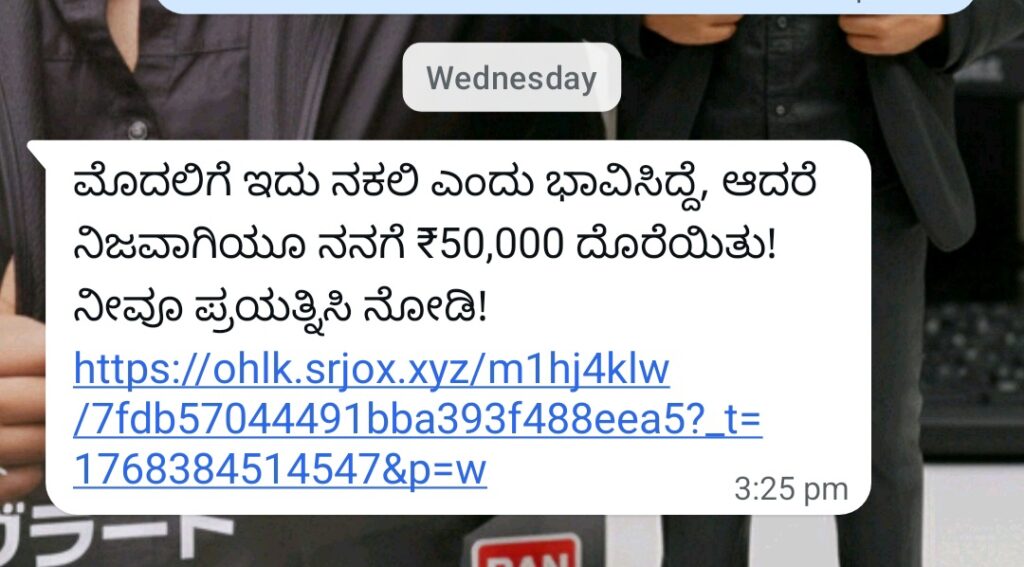 ಇತ್ತೀಚಿನ ದಿನದಲ್ಲಿ ಅತಿ ಹೆಚ್ಚು ವಾಟ್ಸಪ್ ನಲ್ಲಿ ಸ್ಕ್ಯಾಮಗಳು ಆಗುತ್ತಿದೆ ನಿಮ್ಮ ಮೊಬೈಲ್ ಹ್ಯಾಕ್ ಮಾಡೋದು ಅಥವಾ ನಿಮ್ಮ ಮೊಬೈಲ್ ನಲ್ಲಿರುವ ಬ್ಯಾಂಕ್ ಬ್ಯಾಲೆನ್ಸ್ ಹಣವನ್ನ ದೋಚಿಕೊಳ್ಳೋದು ಹಾಗೂ ನಿಮಗೆ ಹೆದರಿಕೆ ಬೆದರಿಕೆ ನೀಡುವುದು ಈ ರೀತಿಯಾಗಿ ಹಲವಾರು ಸಮಸ್ಯೆಗಳು ಬರುತ್ತಾನೆ ಇದೆ ಈಗ ಇತ್ತೀಚಿನದಲ್ಲಿ ಅತಿ ಹೆಚ್ಚು ಸಂಕ್ರಾಂತಿ ಹಬ್ಬ ಮತ್ತು ಜನವರಿ 26ರ ನಿಮಿತ್ಯವಾಗಿ ಈಗ ನಿಮಗೆ ಹೊಸದಾಗಿ ಮೆಸೇಜ್ ಕಳಿಸಿಕೊಡುತ್ತಿದ್ದಾರೆ, “ನಾನು ಮೊದಲಿಗೆ ಇದು ಸುಳ್ಳ ಎಂದು ನಂಬಿದ್ದೆ ಆದರೆ ನನಗೆ 50,000 ನಿಜವಾಗಲೂ ಬಂತು ನೀವು ಕೂಡ ಪ್ರಯತ್ನ ಮಾಡಿ ನಿಮಗೂ ಬರುತ್ತೆ,” ಹೀಗೆ ನಿಮಗೆ ಮೆಸೇಜ್ ಬರುತ್ತಿದೆ ಈ ರೀತಿಯಾಗಿ ಬಂದರೆ ಇದು ನಿಜ ಅಲ್ಲ ಇದು 100% ಸುಳ್ಳು ಸುದ್ದಿ ಆಗಿರುತ್ತದೆ ಯಾರು ಕೂಡ ನಿಮಗೆ ಹಣವನ್ನ ನೀಡುವುದಿಲ್ಲ ಇದು ನಿಮ್ಮ ಲಿಂಕ್ ಮೇಲೆ ಕೊಟ್ಟಿರುವ ಫಿಲಿಪ್ ಮಾಡಿದರೆ ನಿಮ್ಮ ಬ್ಯಾಂಕ್ ಖಾತೆಗಳು ಹಾಗೂ ನಿಮ್ಮ ಮೊಬೈಲ್ ಹ್ಯಾಕ್ ಆಗುವ ಸಾಧ್ಯತೆ ಇದೆ ಮತ್ತು ನಿಮ್ಮ ಬ್ಯಾಂಕಿನಲ್ಲಿರುವ ಹಣವನ್ನ ದೋಚಿಕೊಳ್ಳುತ್ತಾರೆ ಎಚ್ಚರ ಎಚ್ಚರ,